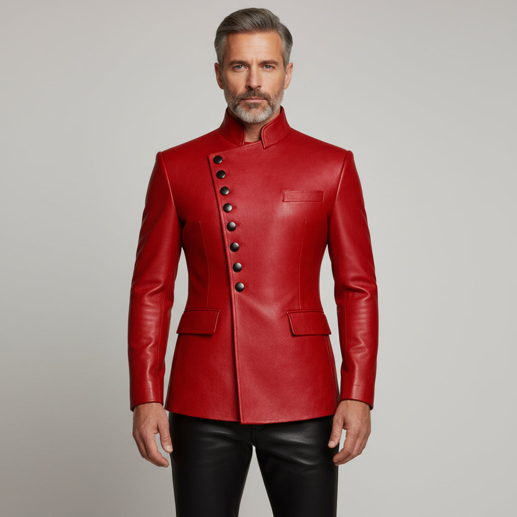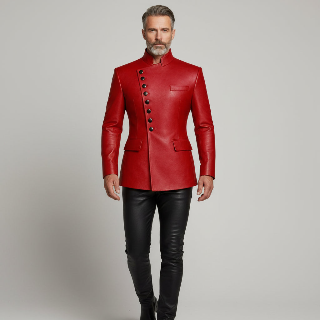 Designed for men who embrace bold fashion with refined control, this red leather statement jacket delivers a striking presence with clean sophistication. The asymmetrical buttoned front creates visual depth, while the rich red tone adds confidence without overpowering the silhouette.