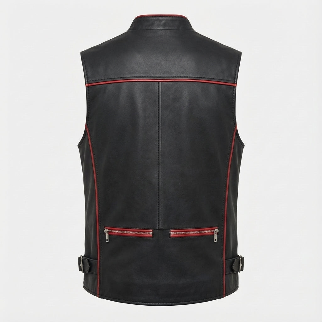 Designed for men who embrace bold attitude with refined edge, this black leather statement vest delivers a powerful biker-inspired look through asymmetrical construction and striking red zipper accents. The angled front closure creates visual depth, while the red contrast piping sharpens the overall silhouette.