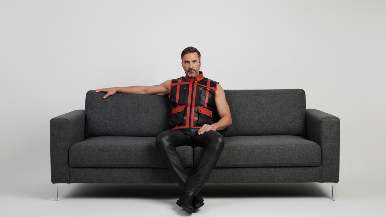 Designed for bold expression, this men’s black PU leather vest combines a sleek silhouette with striking red strip detailing and red pocket flaps for a sharp, high-contrast look. The clean structure keeps the design refined, while the red accents introduce a confident, fashion-driven edge.