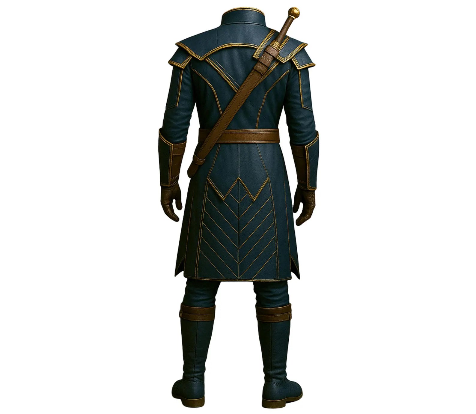 ⏩ Unleash your inner monster hunter with this Witcher-inspired leather armor set, designed for ultimate style, durability, and authenticity. Crafted from premium genuine leather, this set includes a one-piece body armor and matching pants in a striking midnight blue with bold gold seamwork, meticulously stitched with quilted detailing and reinforced for an armored aesthetic.