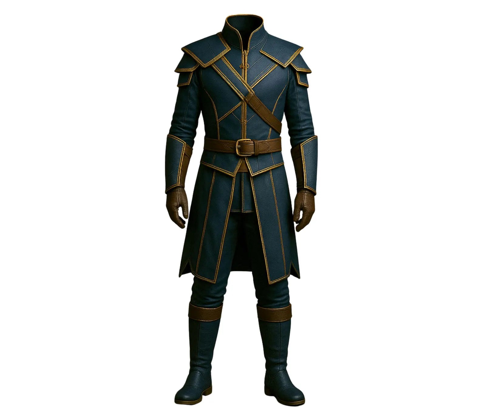 The high-collared, structured design features layered shoulder guards, fitted sleeves, and adjustable straps for a tailored fit. The intricate stitch patterns and battle-ready look make it ideal for cosplay, LARP, and fantasy events.
