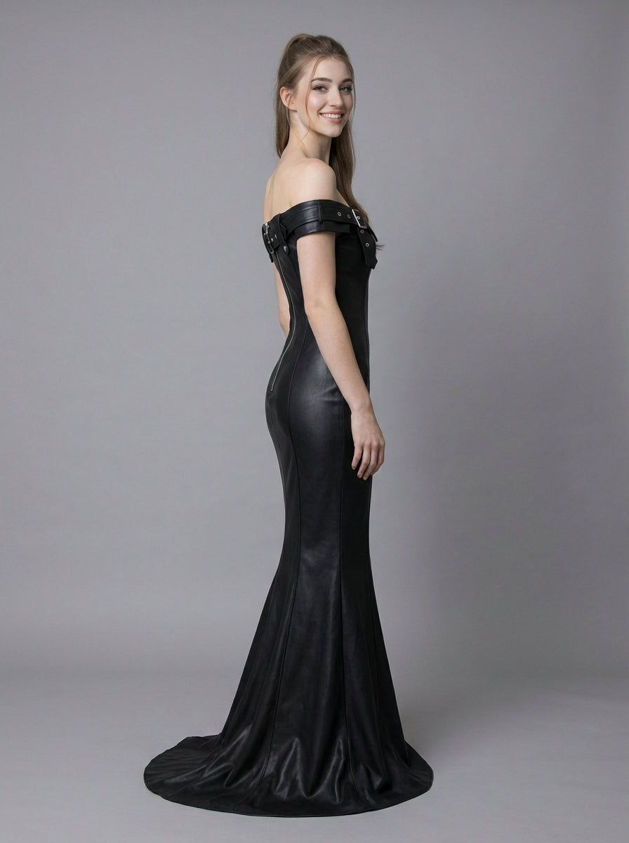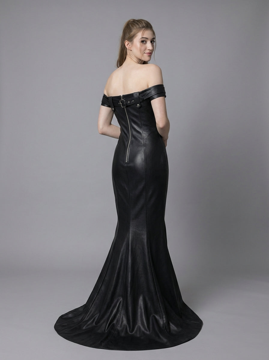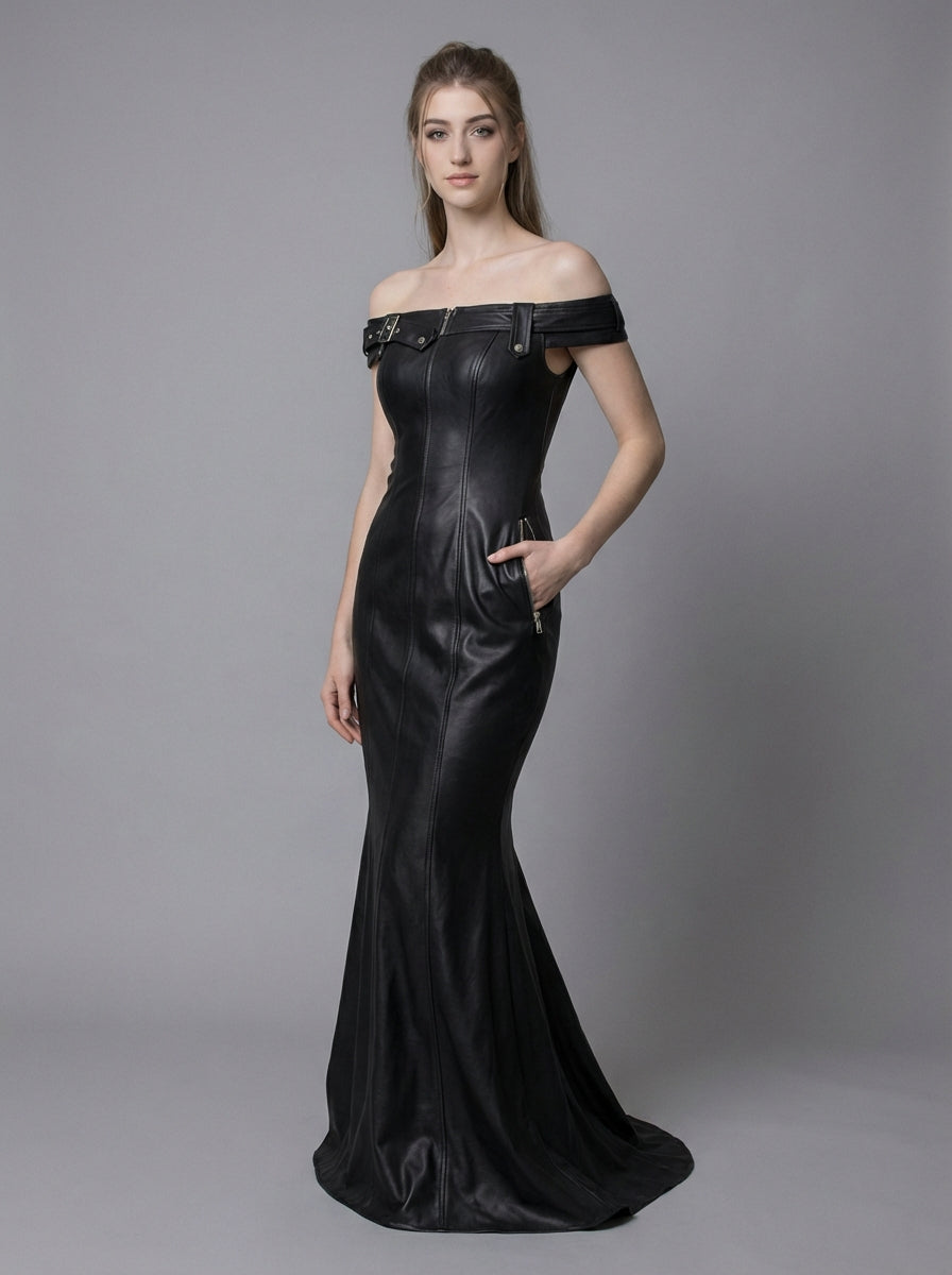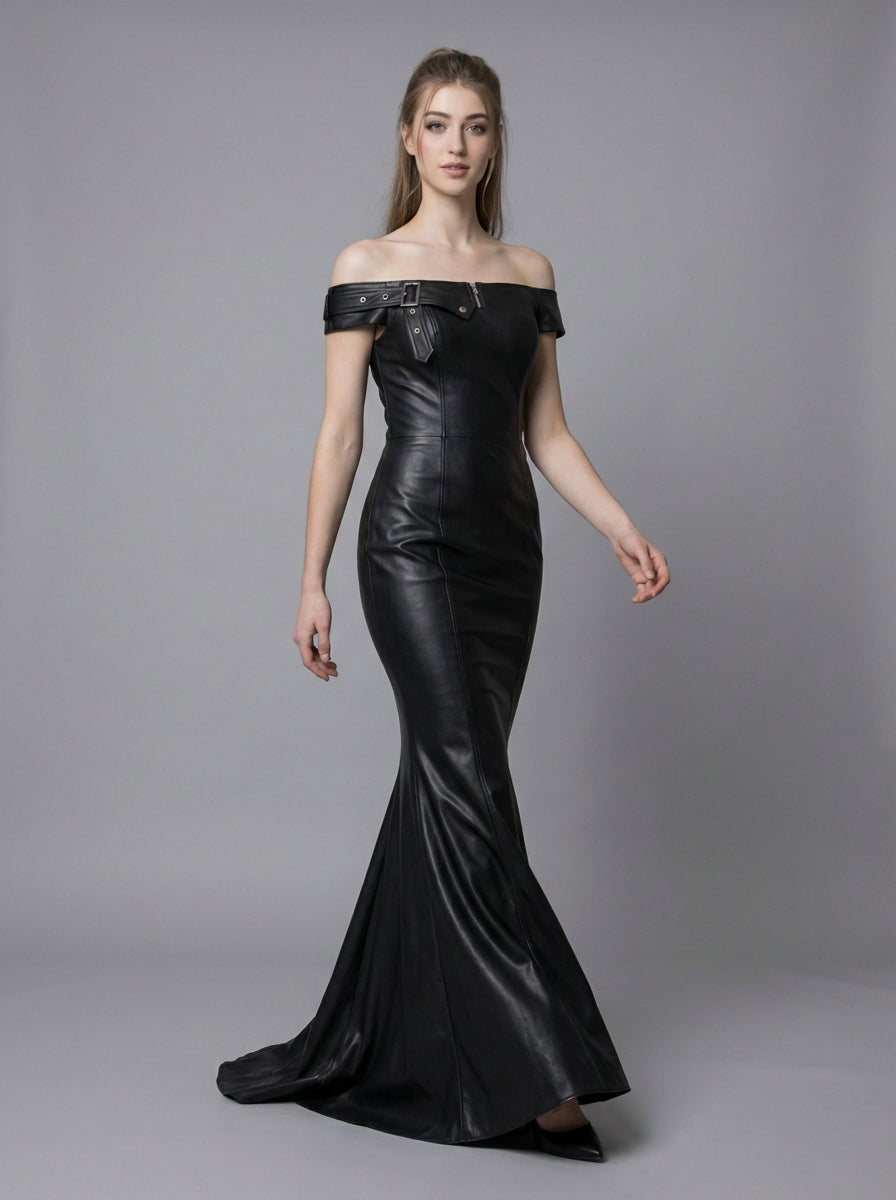 Crafted from 100% genuine leather, this off shoulder mermaid formal dress delivers architectural precision and timeless appeal. The sleek construction enhances natural curves while the mermaid cut flows into a floor-length finish, making it a powerful statement piece for women seeking a distinctive leather evening dress.