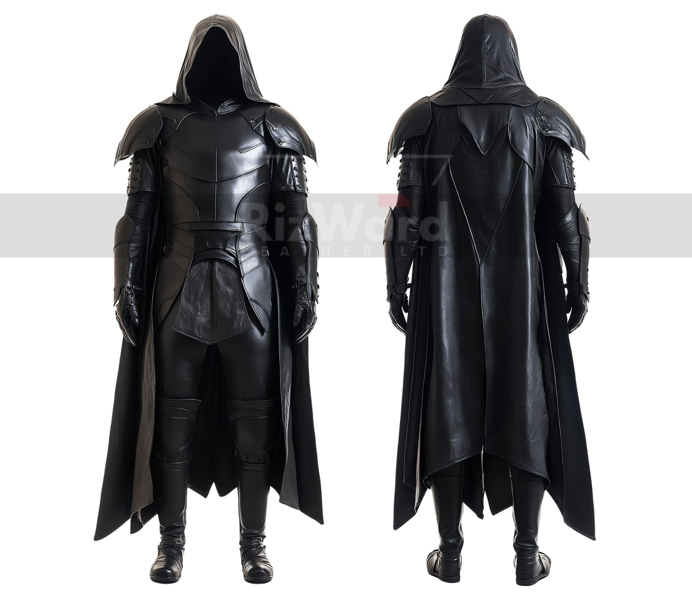 The cloak features a dramatic, mid calf length design with a deep hood for a sense of mystery and concealment. It is complemented by layered chest armor, large shoulder pauldrons, blending medieval armor elements with modern design for both style and functionality.