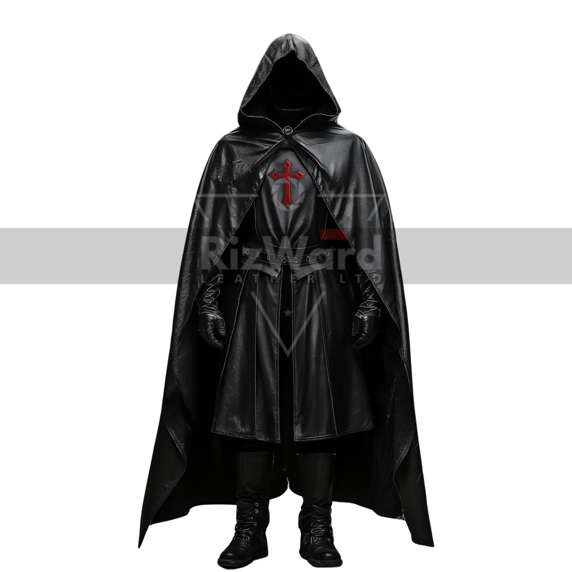 Embrace the mystique and power of gothic elegance with this handcrafted black hooded leather knight cloak. Featuring a bold red cross emblem at the chest, this design draws inspiration from Templar armor, blending historical elements with a modern edge.