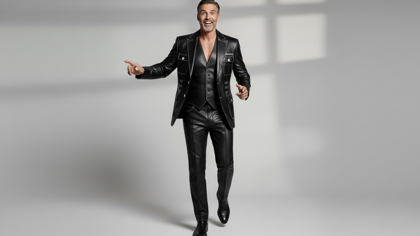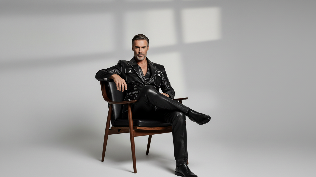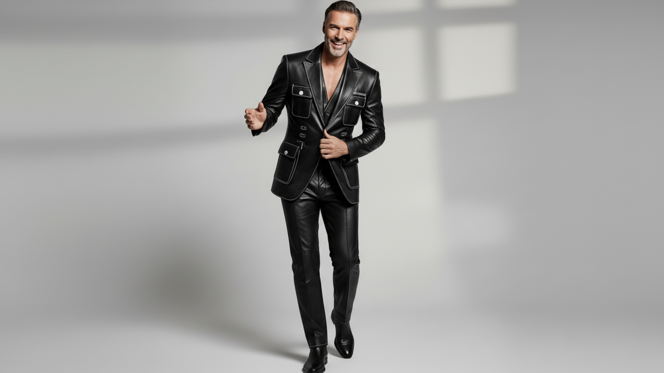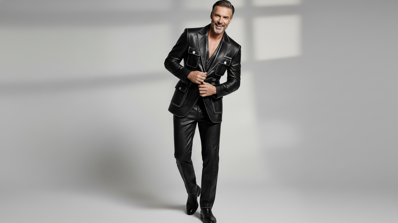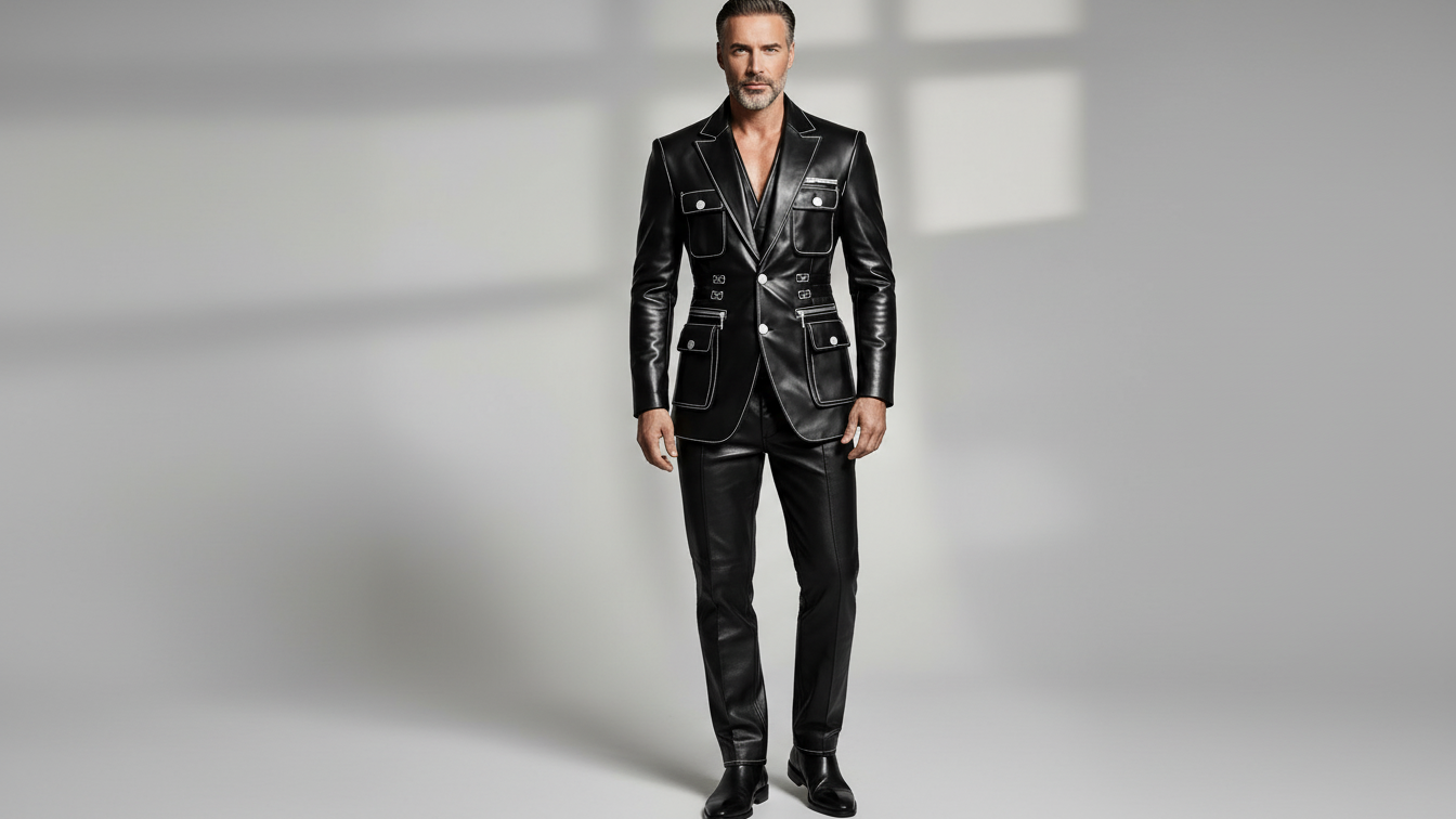 Designed for men who value sharp tailoring with functional edge, this black leather utility blazer blends classic structure with modern statement detailing. The clean notch lapel design is elevated with contrast stitching, creating a refined yet bold silhouette that stands out without excess.