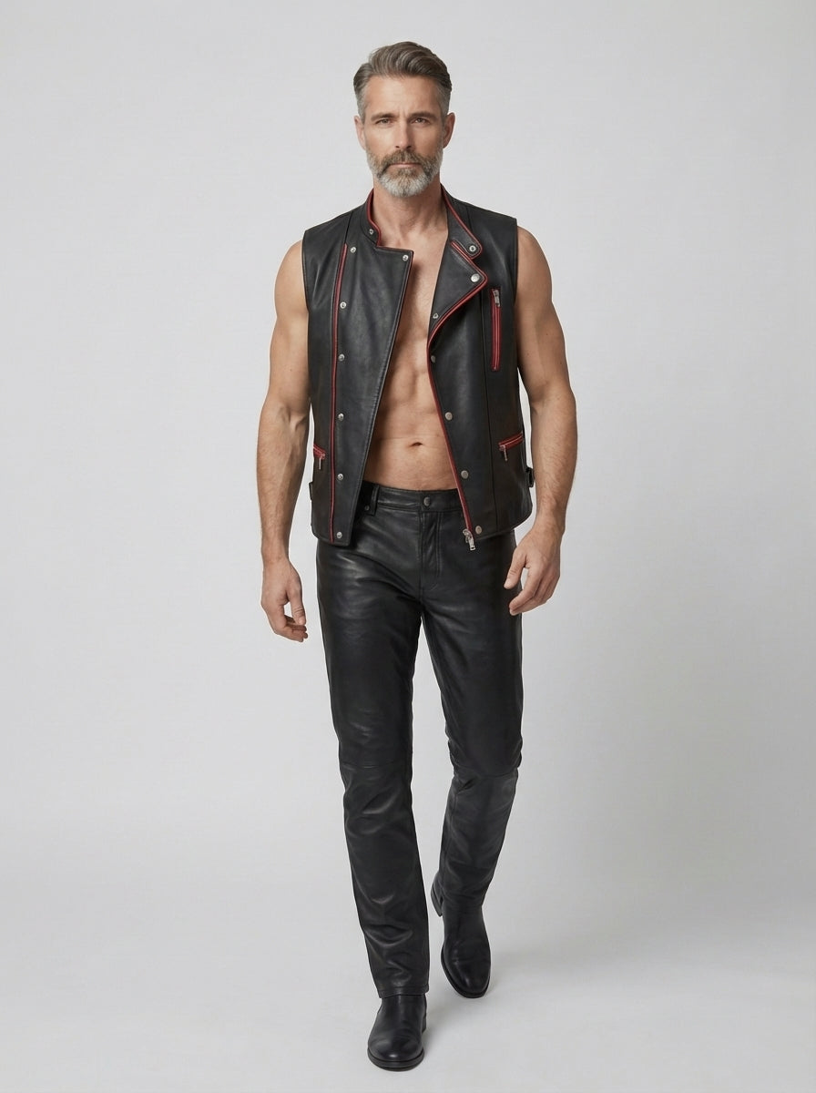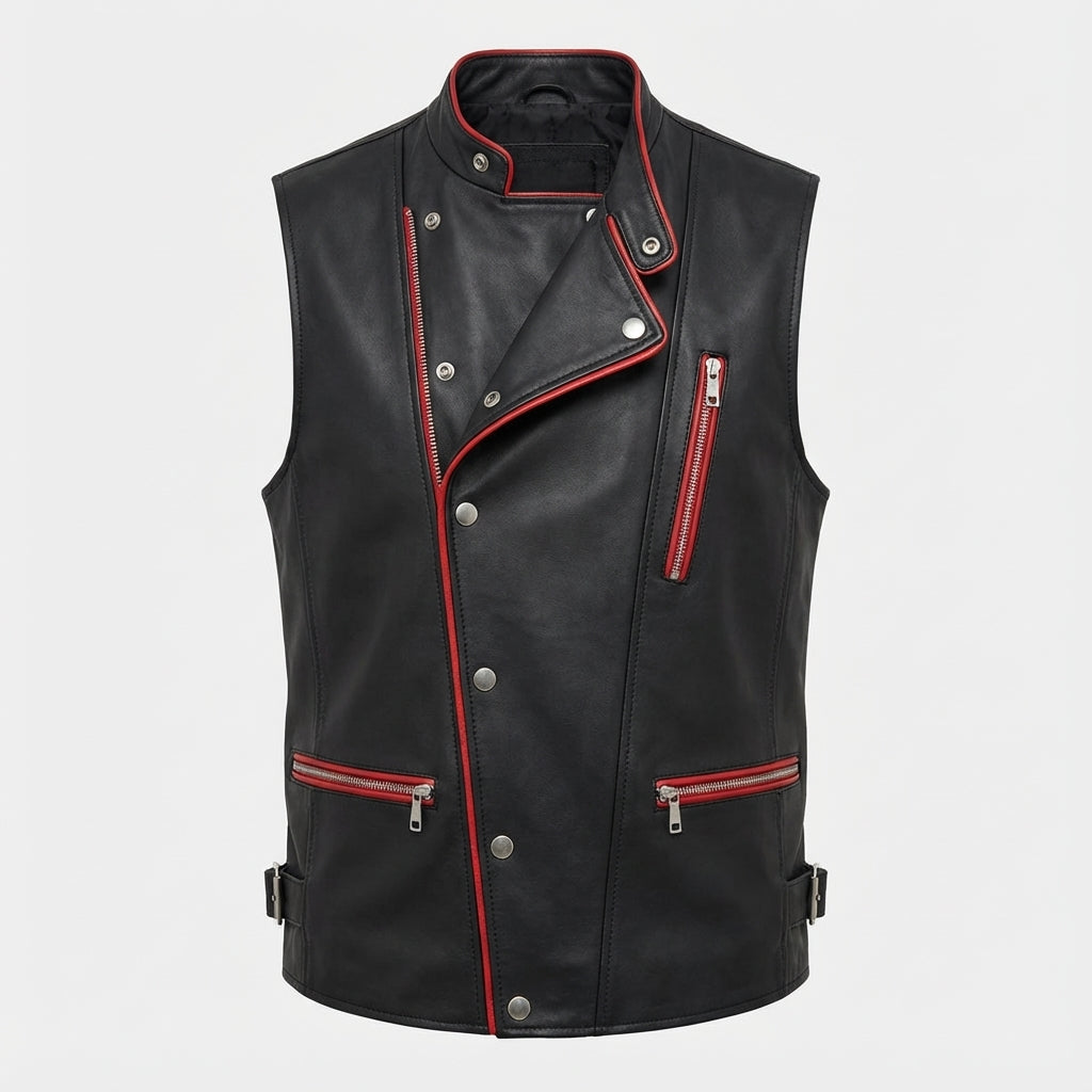 Designed for men who embrace bold attitude with refined edge, this black leather statement vest delivers a powerful biker-inspired look through asymmetrical construction and striking red zipper accents. The angled front closure creates visual depth, while the red contrast piping sharpens the overall silhouette.