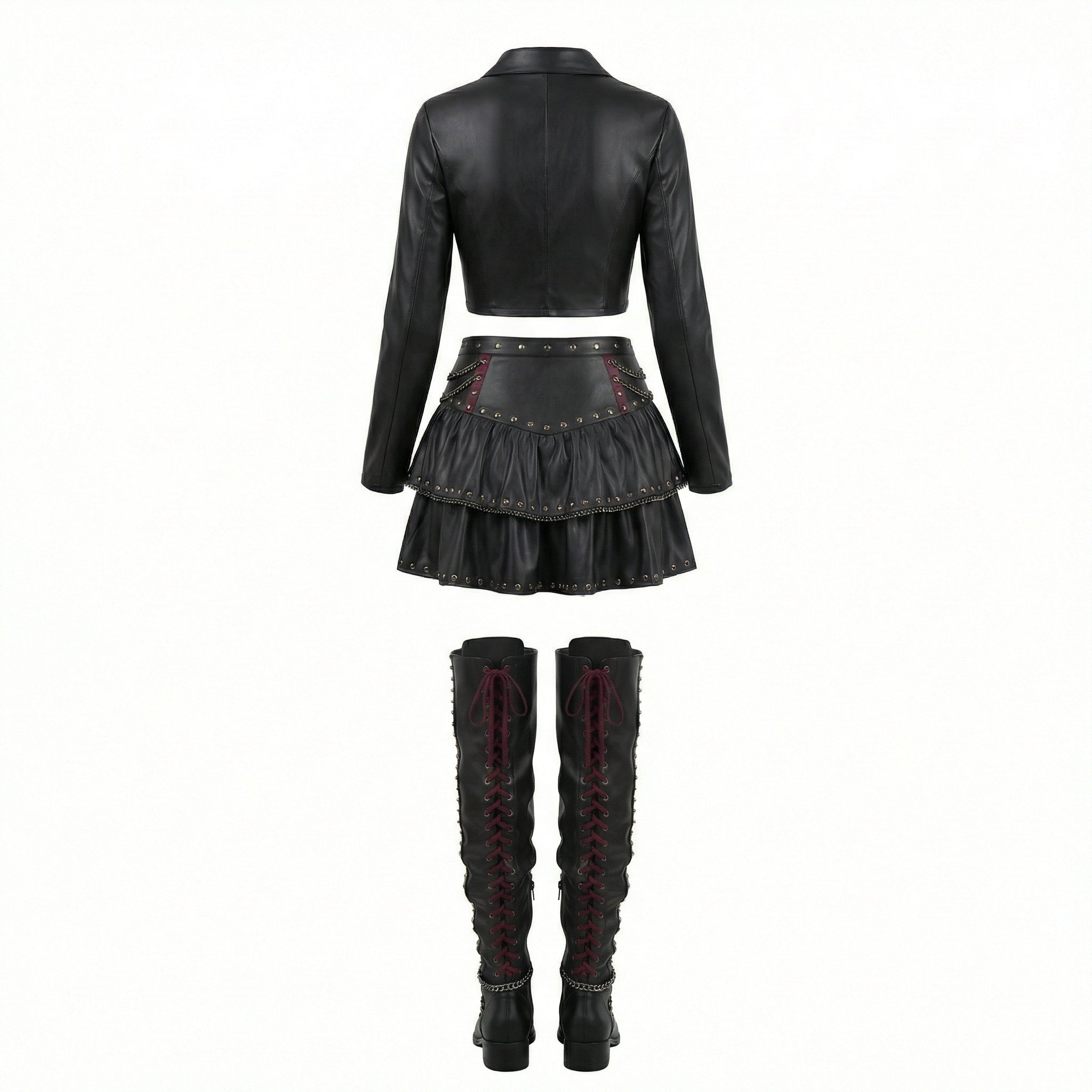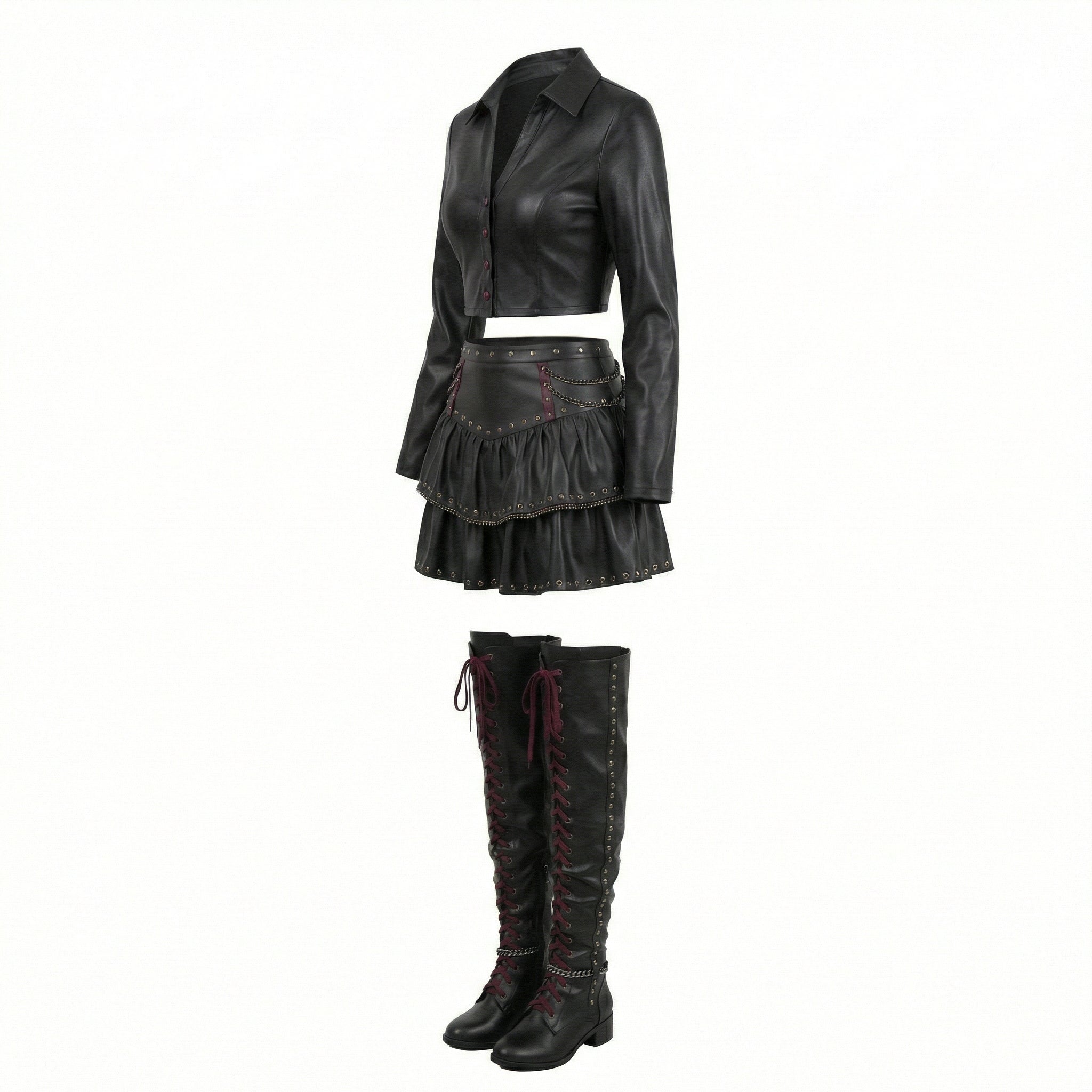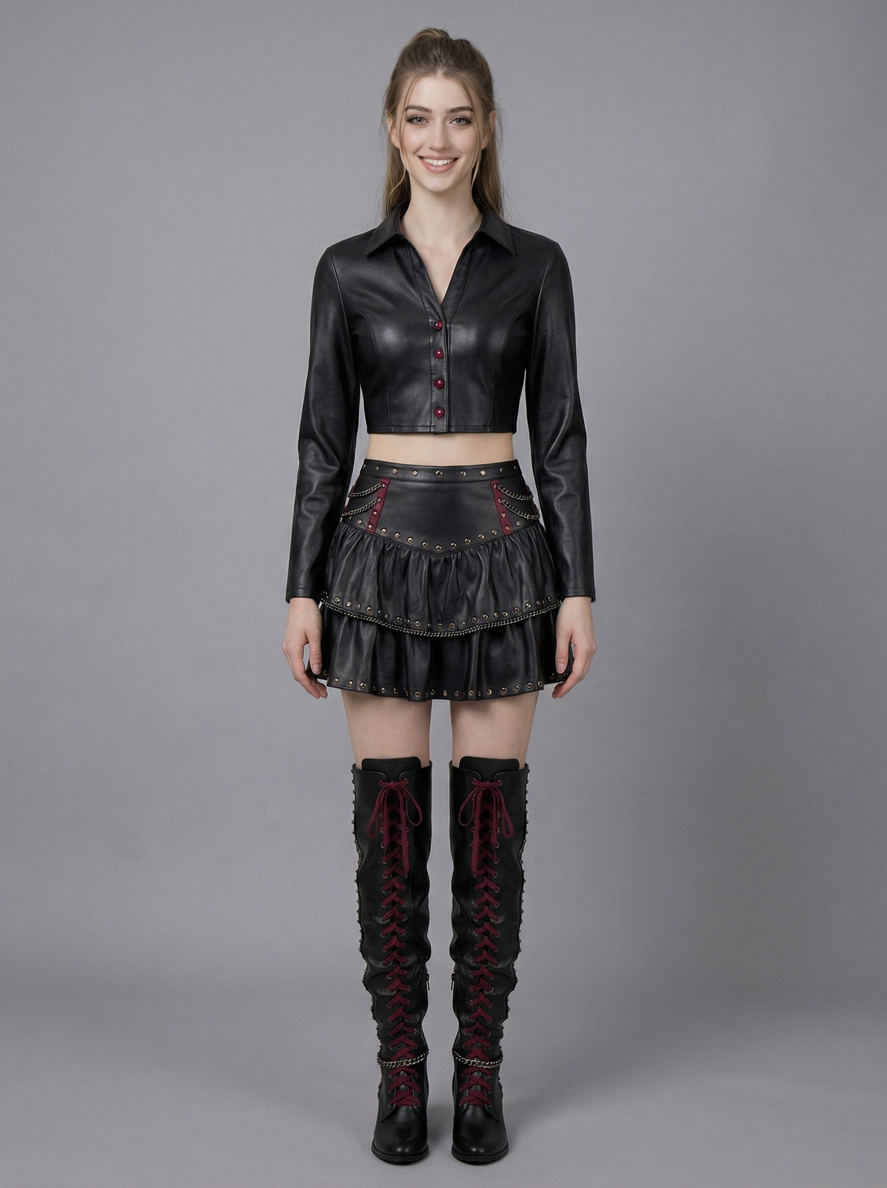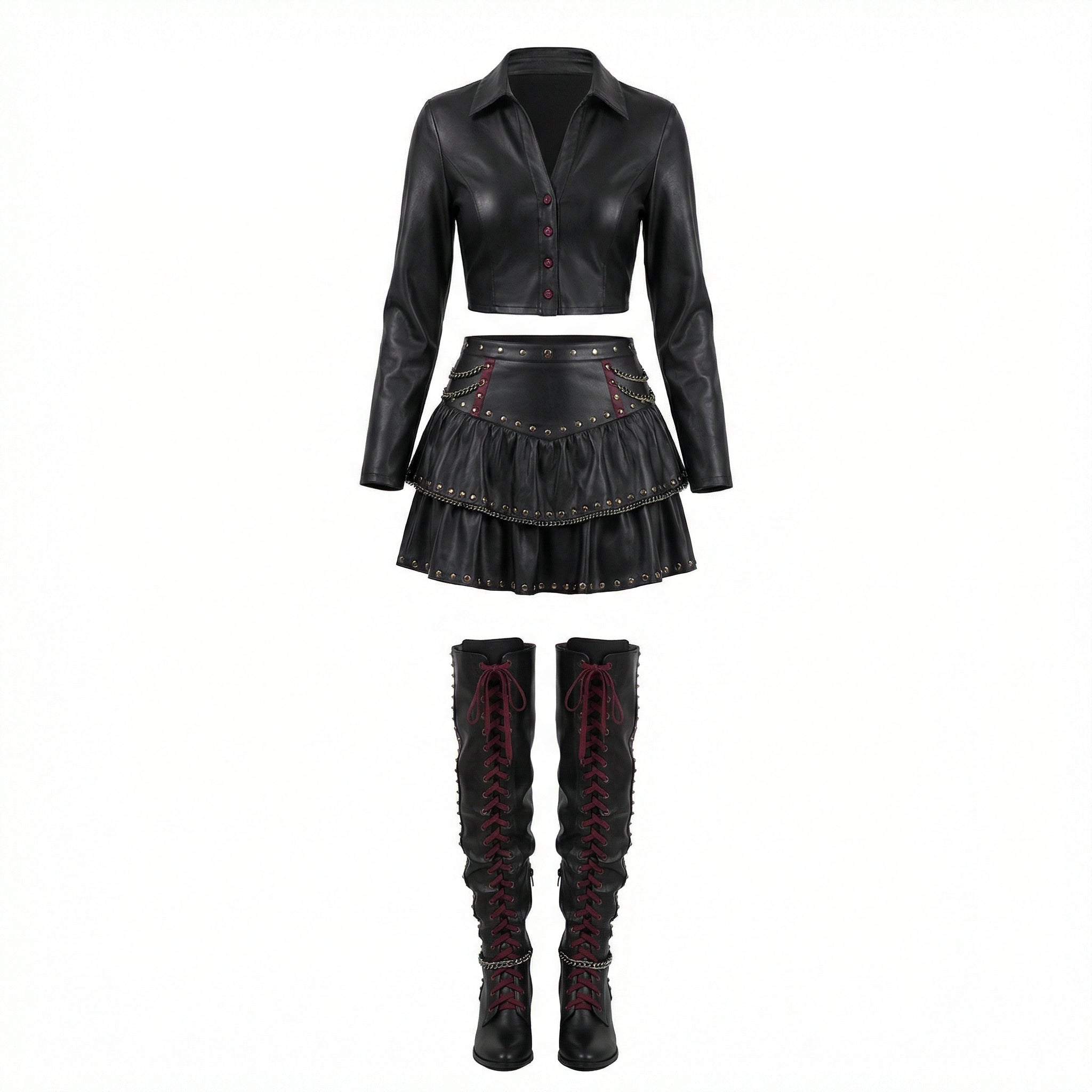 Crafted from 100% genuine leather, this black leather skirt set delivers structure, movement, and high-impact styling. The tailored cropped jacket enhances the silhouette with clean lines and front button detailing, while the tiered mini skirt showcases stud accents and chain embellishments for dramatic depth. Designed for women who embrace confidence and individuality, this leather co-ord set is ideal for gothic fashion styling, alternative luxury events, stage performances, concerts, editorial shoots, and statement streetwear.