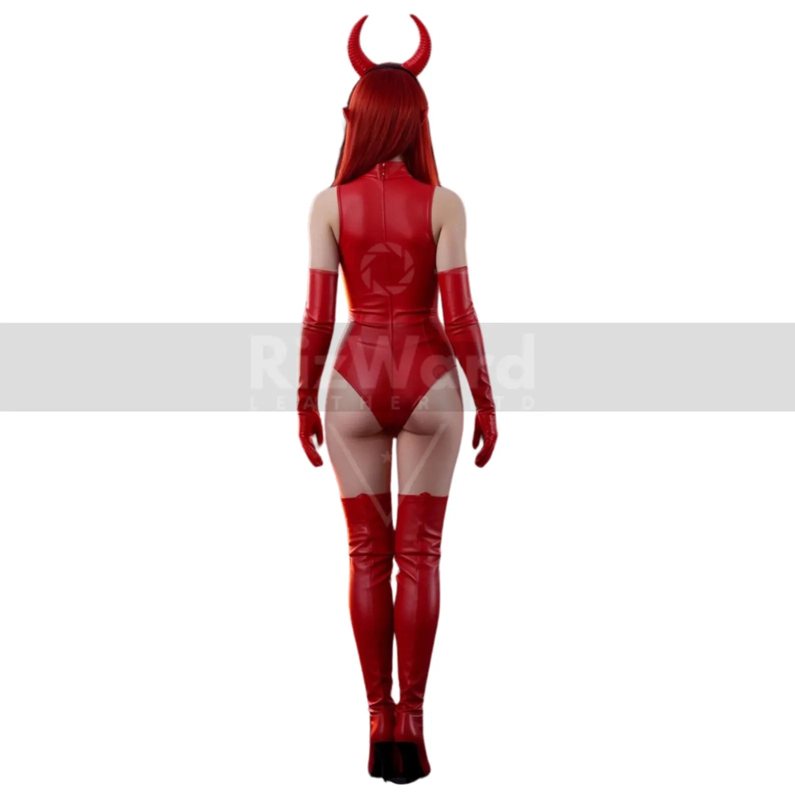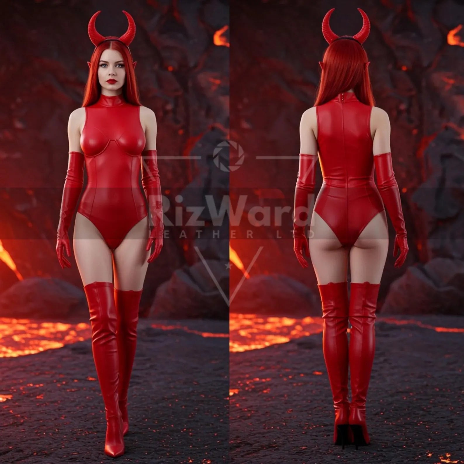 Turn up the heat in this seductive Red Devil Bodysuit Costume, designed to command attention and inspire playful mischief. Crafted from genuine leather, this daring set hugs your curves with a bold, high-gloss finish.