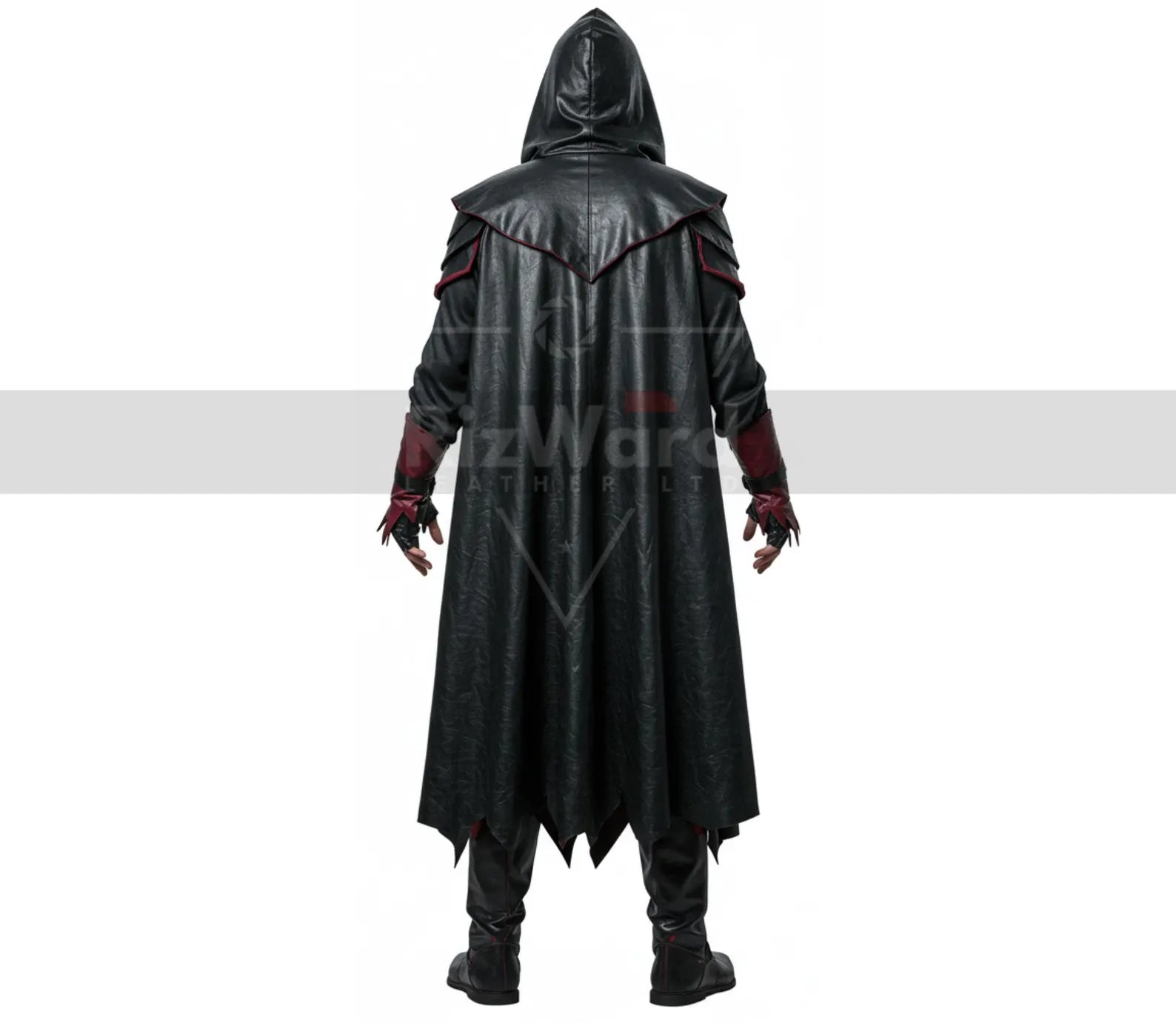 The outfit features a structured genuine leather tunic with jagged hems, adjustable belt accents, and dramatic layered shoulder panels. Long black sleeves are bound in red bracers. A sweeping black cloak with crimson trim, flowing from a wide-shouldered drape to razor-cut edges – all framed by a towering hood perfect for shadowy reveals.