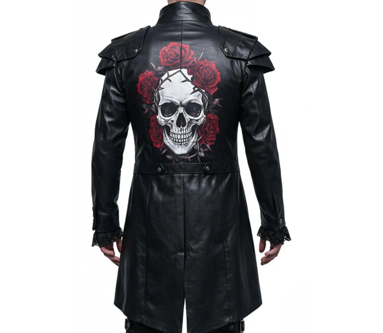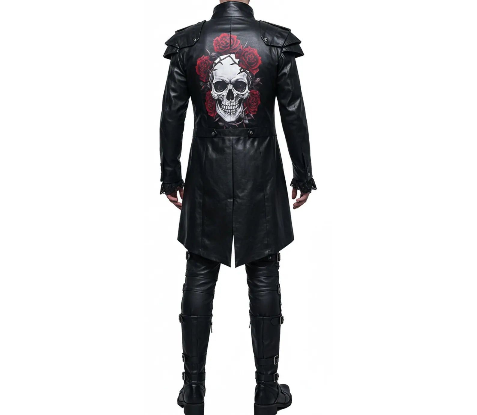 Turn heads this Halloween with this bold gothic vampire ensemble. This men's victorian costume features a deep red vest in a clean, plain finish — free of distractions — layered beneath a striking black leather long coat. The back of the coat steals the show with a dramatic skull and red rose print, adding a dark romantic flair.