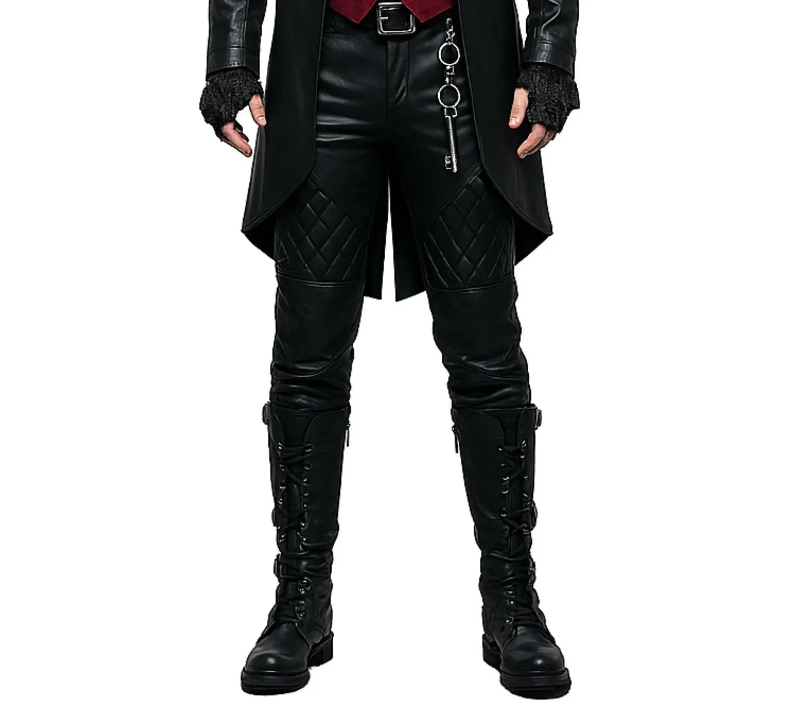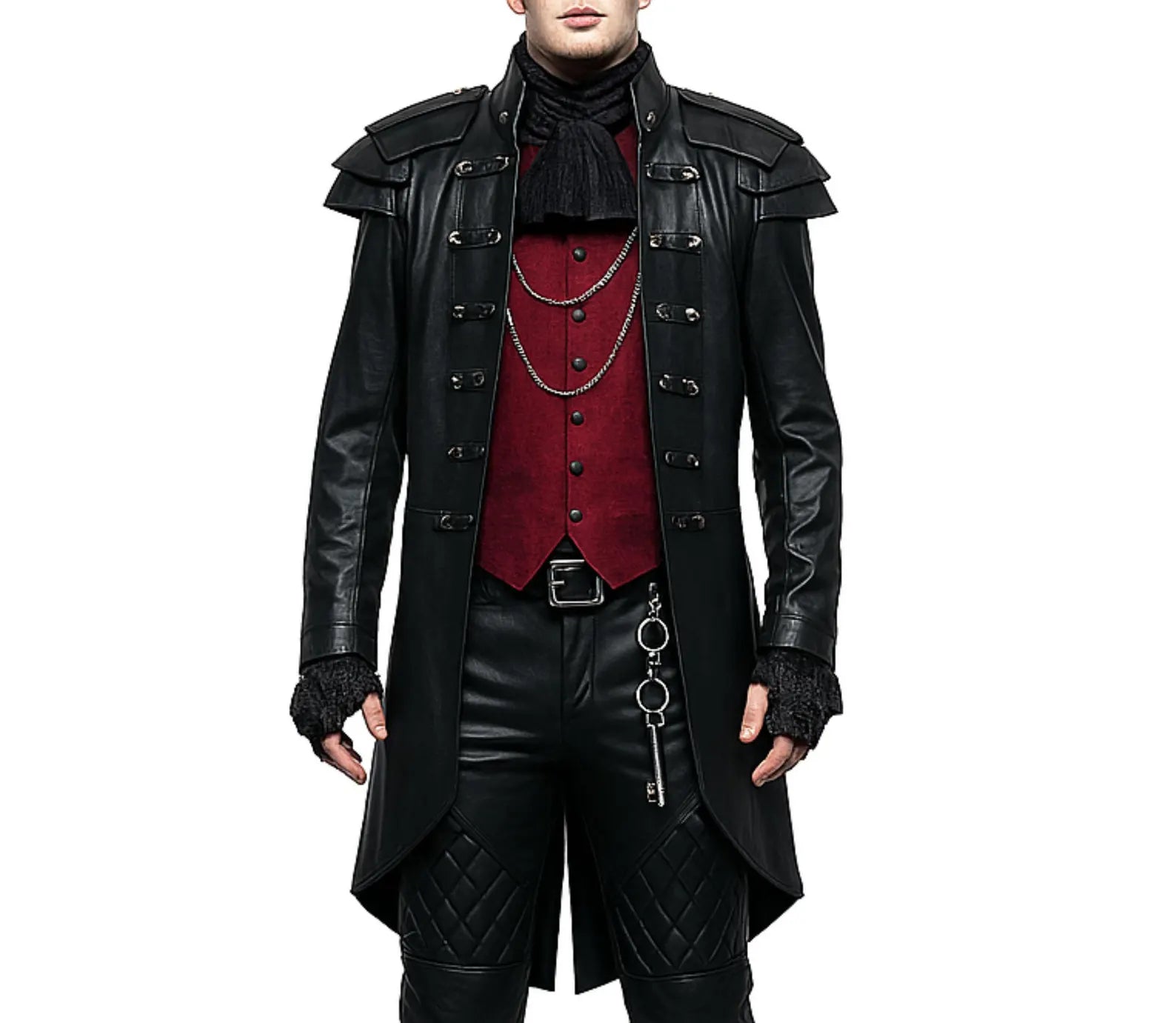 Complete with silver chains, military-style buckles, quilted leather pants, and gothic accessories like lace cuffs and a jabot cravat, this outfit is tailored for the bold — perfect for vampire lords, gothic aristocrats, or dark-themed stage performers.