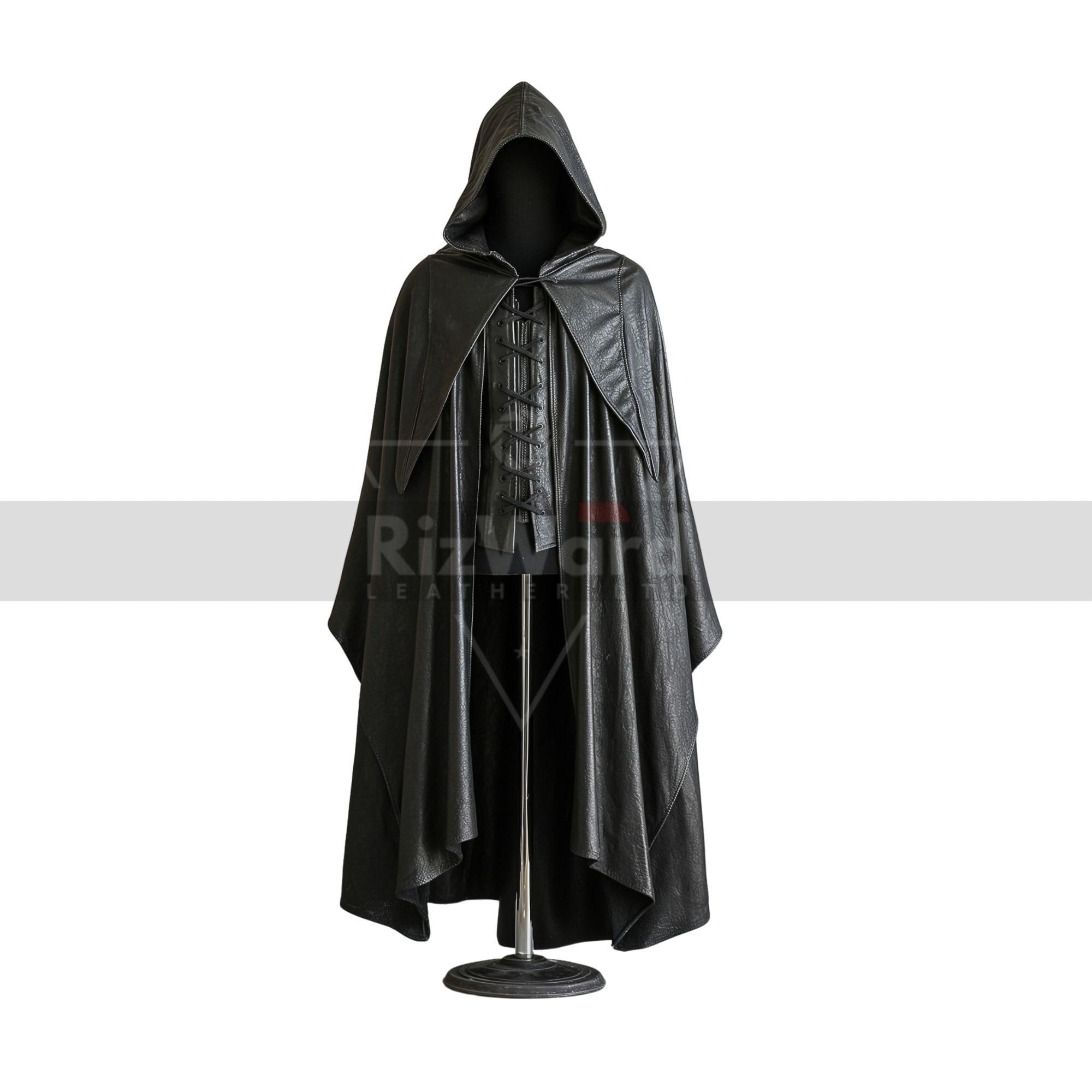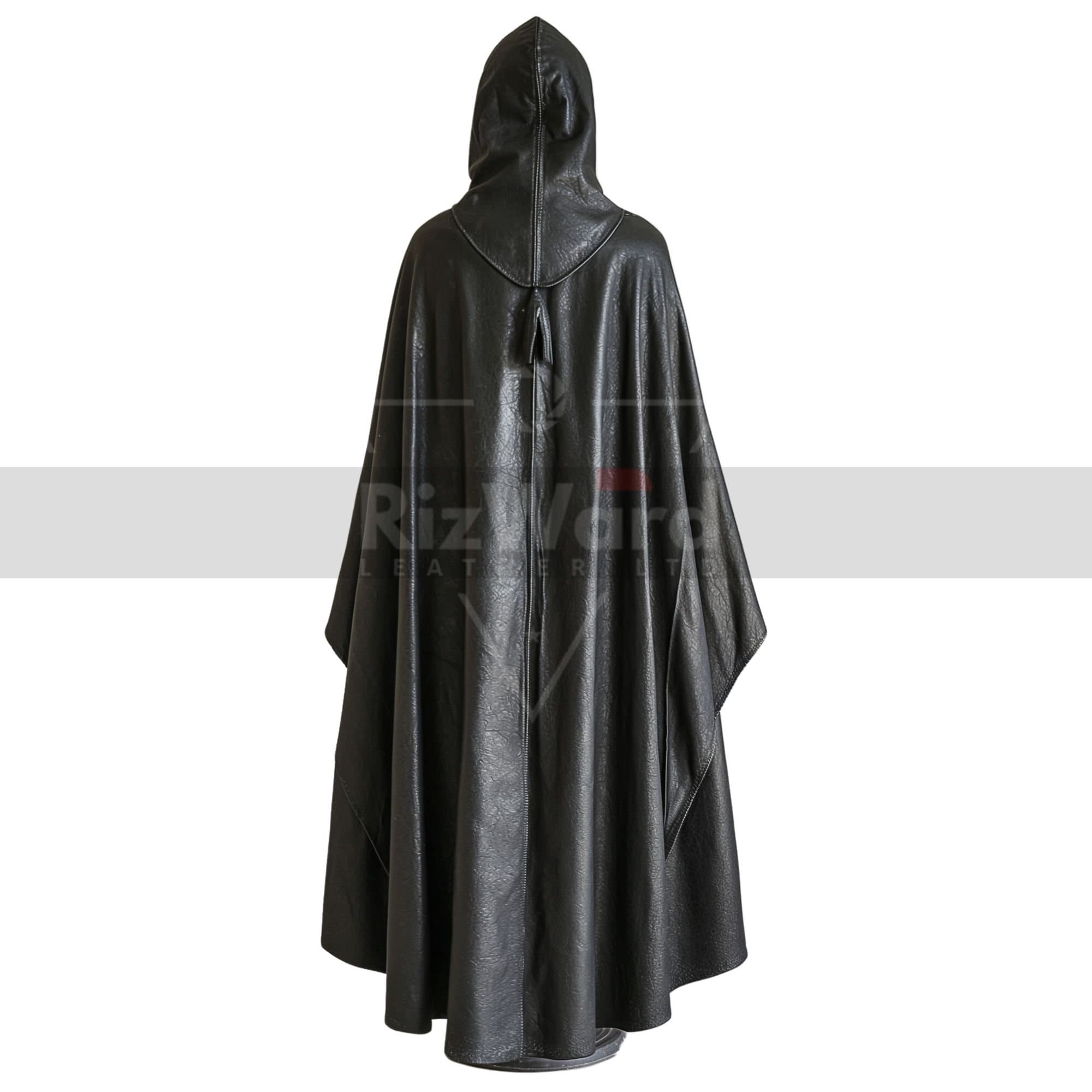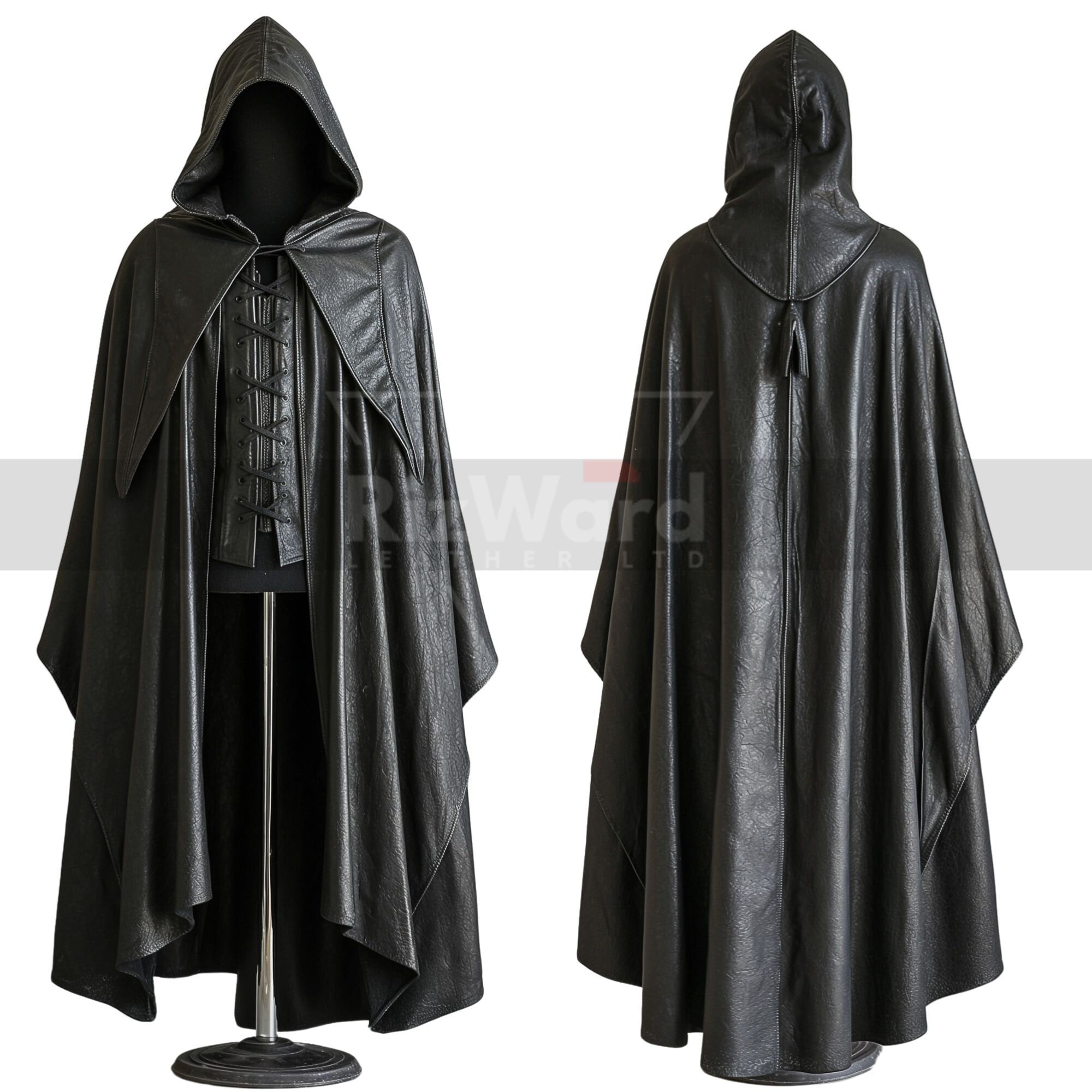 Immerse yourself in medieval fantasy with our Handmade Black Leather Medieval Hooded Cloak. Crafted with meticulous attention to detail, this cloak boasts a sleek and stylish look, complemented by its comfortable inner satin lining. Ideal for cosplay enthusiasts and themed events, this cloak adds a touch of timeless elegance and mysterious allure to any outfit.
