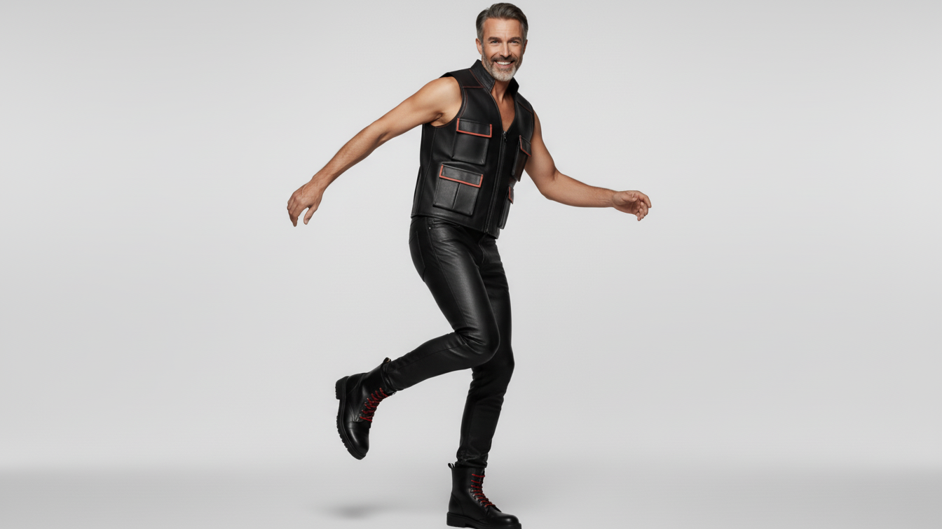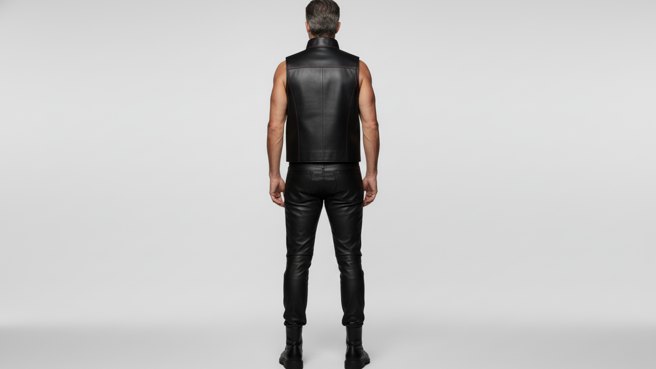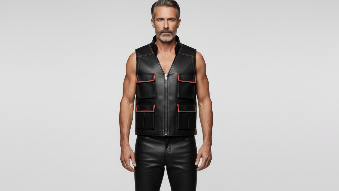 Minimal in form yet bold in detail, this men’s black PU leather vest is defined by precise contrast accents. The red-trimmed pocket flap borders and red shoulder stitching add subtle but striking visual interest while preserving a clean, structured silhouette.